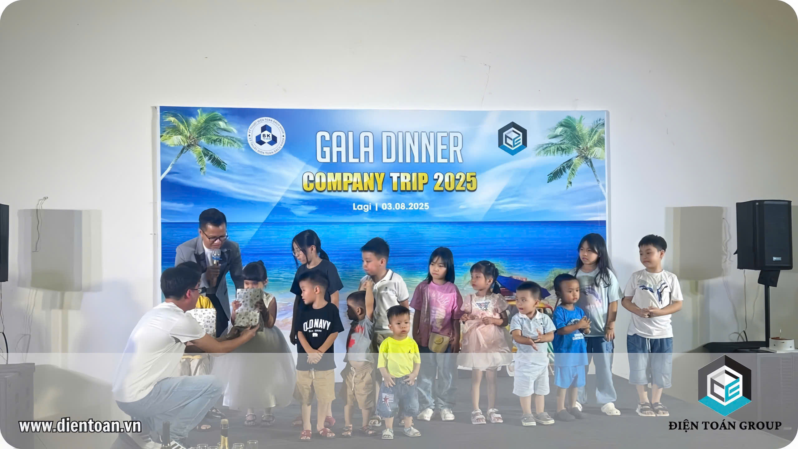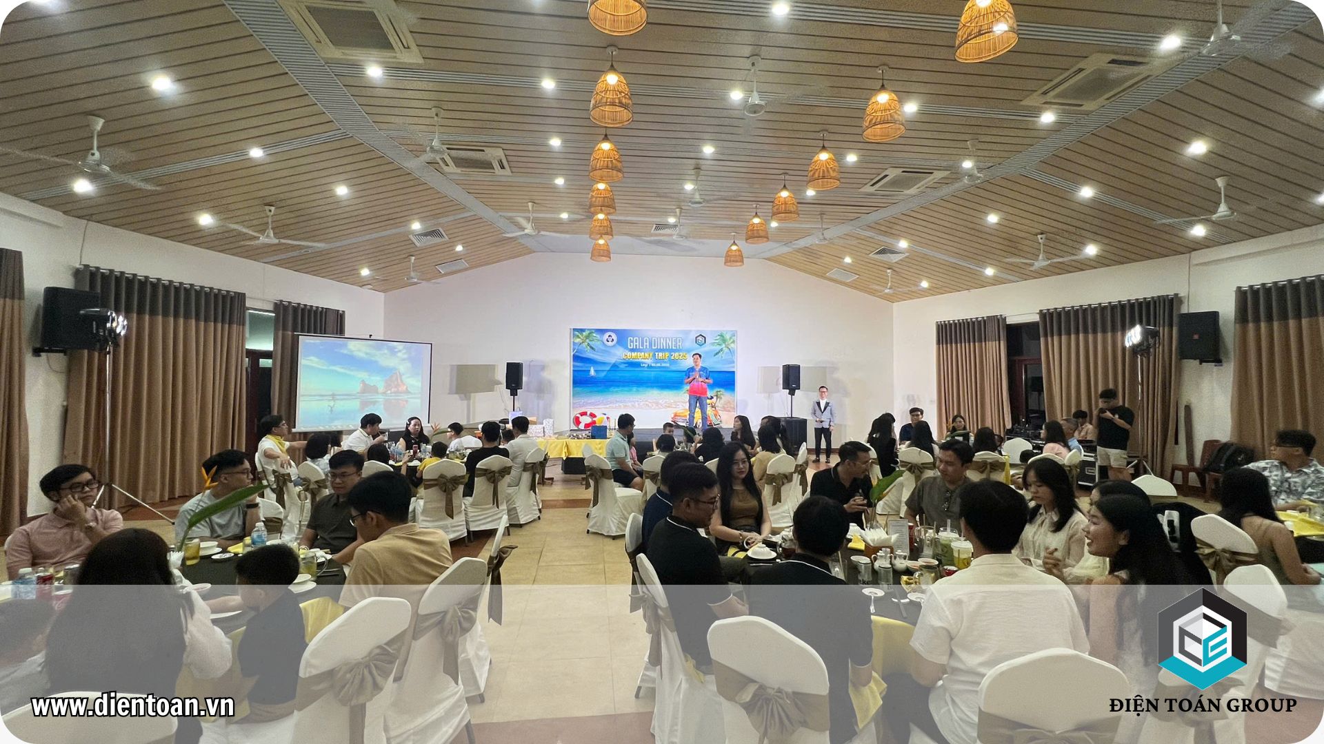 Buổi tối, không khí càng trở nên lung linh và ấm áp hơn với bữa tiệc Gala Dinner được tổ chức long trọng, thu hút các thành viên hứng khởi tham gia với nhiều nội dung, chương trình phong phú, đa dạng. Dưới ánh đèn huyền ảo và tiếng sóng biển rì rào, mọi người cùng thưởng thức những món hải sản tươi ngon đặc trưng của vùng biển La Gi và những tràng pháo tay giòn giã chúc mừng cho sự phát triển không ngừng của Điện toán Group trước những thành công hiện tại và cùng hướng tới một tương lai tươi sáng sau lời phát biểu, nâng ly khai tiệc của Ban lãnh đạo Điện toán Group và các công ty thành viên. Những tiết mục văn nghệ "cây nhà lá vườn", các trò chơi dân gian và những khoảnh khắc tri ân đầy bất ngờ đã khiến bữa tiệc thêm phần sôi động và tràn đầy ý nghĩa.